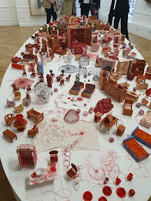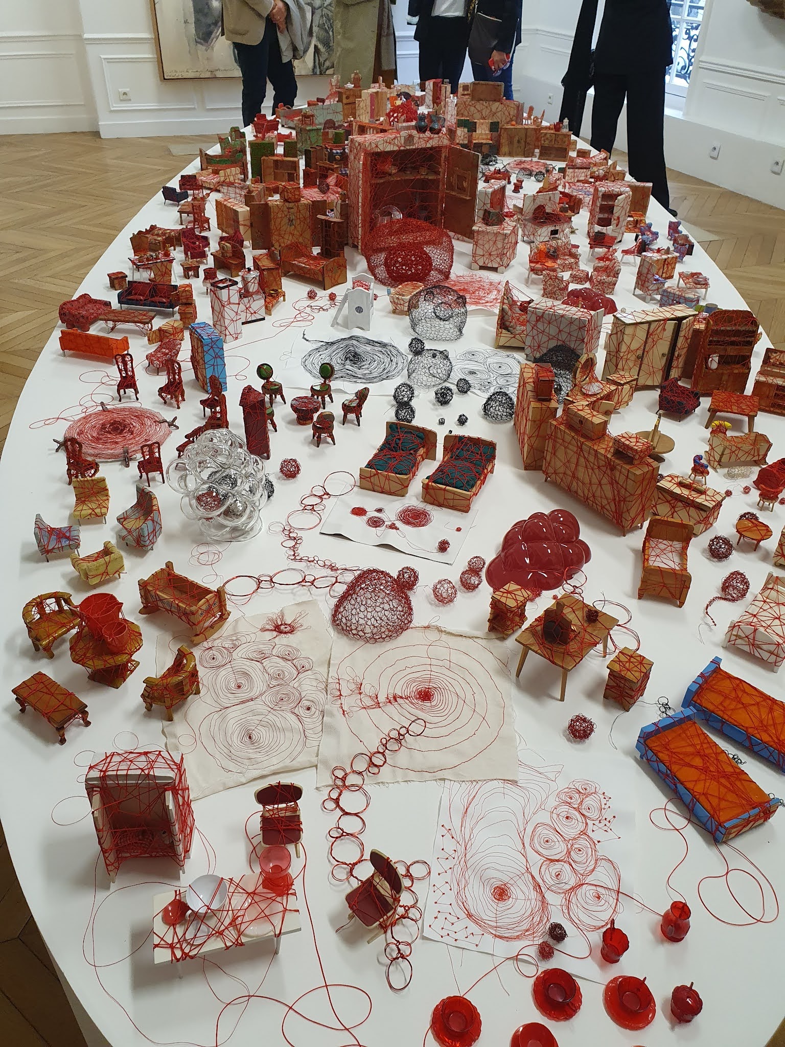La galerie Templon présente, également, l’artiste japonaise Chiharu Shiota, elle vit et travaille à Berlin. Elle a imaginé pendant la pandémie, une oeuvre de deux métres sur six métres  « Living Inside » mélangeant un mobilier de maison de poupée et d’objets recyclés miniatures, tissés avec du fil rouge. Elle joue sur les notions de temporalité en son centre du corps et du mouvement. Son oeuvre a été vendue 350 000 euros à un musée chinois