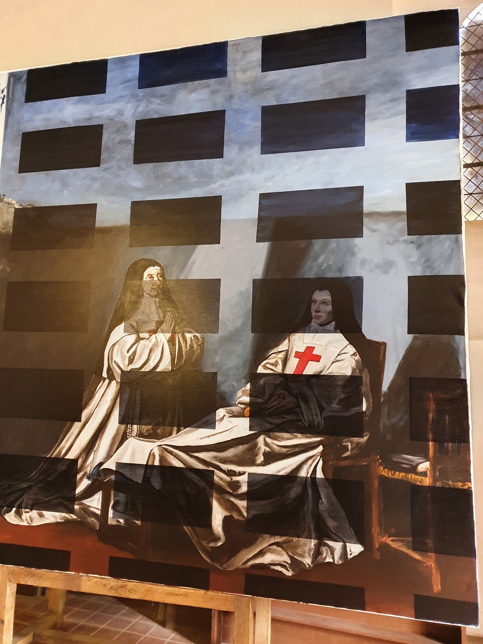 Martin Bruneau, peintre figuratif, né au Canada, vit à Autun. Il se réappropie les références iconographiques de la peinture et questionne la peinture au pinceau. Il utilise l’histoire de la peinture, comme thème à peindre, aussi, ne peut-il ignorer l’art sacré. Il présente « Mirabilis blanc » quadrillage en creux et « Mirabilis noir » quadrillage en plein, recouvrant de façon complémentaire les deux toiles monumentales faites en 2008 pour l’Abbaye de Maubuisson, haut lieu du Jansénisme. Il est défendu par la galeriste Isabelle Gounot, Paris. Les oeuvres sont montrées dans le Temple Protestant, Porte Saint André.