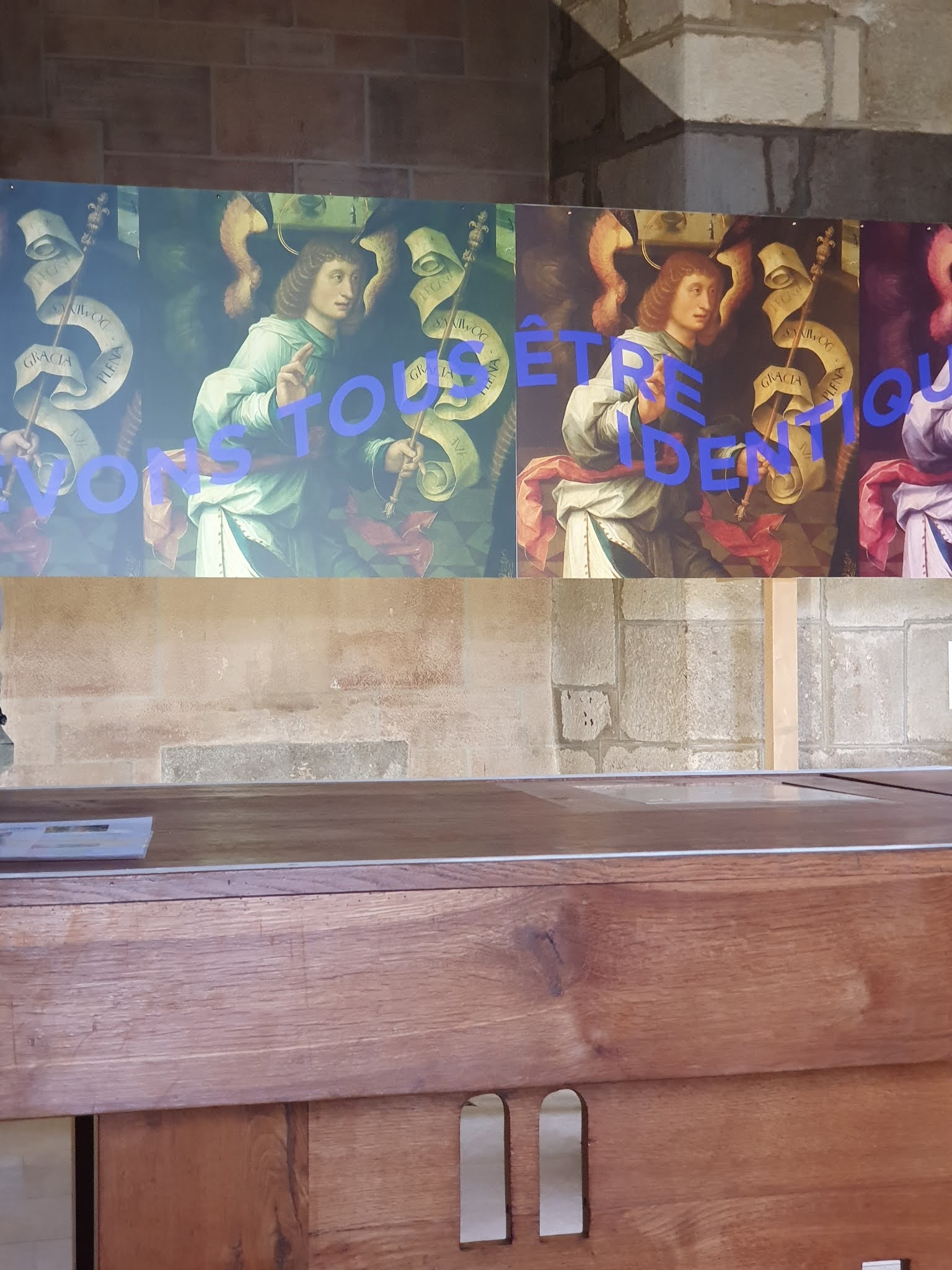–  Ken Aptekar vit et travaille aux Etats-Unis. Il mêle peinture et texte. Déjà, dans les années 70, on disait  que la peinture vivait ses dernières heures. Les nouvelles formes artistiques prenaient place, la reléguant au dernier rang. Aussi, il eut l’idée d’adopter de vieilles peintures, en y incorporant des mots de nos pensées. L’oeuvre « Neighbors/Voisin.e.s. » est à l’origine de la demande faite en 2016  par le directeur du musée Saint Anne à Lübeck en Allemagne. Ce musée détient une incroyable collection de retables et de faire la relation avec l’unique synagogue restante au Nord de l’Allemagne. Il cherche à faire disparaître les frontières persistantes entre les êtres. D’où l’exposition qu’il fit au musée Saint Anne à Lübeck et que l’on retrouve maintenant à la Chapelle Saint Aubin.